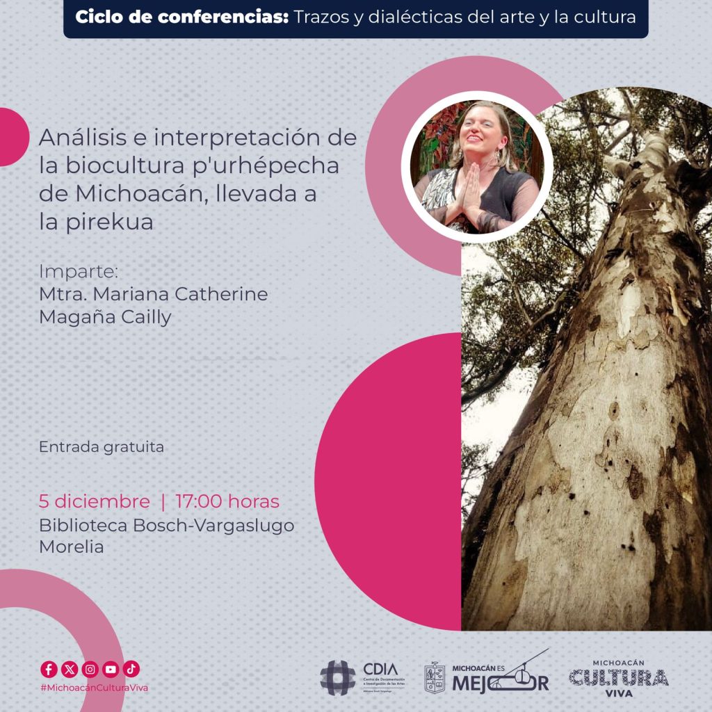 Morelia, Michoacán, 4 de diciembre de 2025.- La Secretaría de Cultura de Michoacán (Secum) invita al público a la conferencia sobre la biocultura purhépecha reflejada en la pirekua, que se llevará a cabo este viernes 5 de diciembre a las 17:00 horas, en la Biblioteca Bosch-Vargaslugo del Centro Cultural Clavijero. La entrada será gratuita.