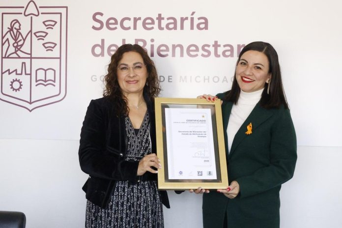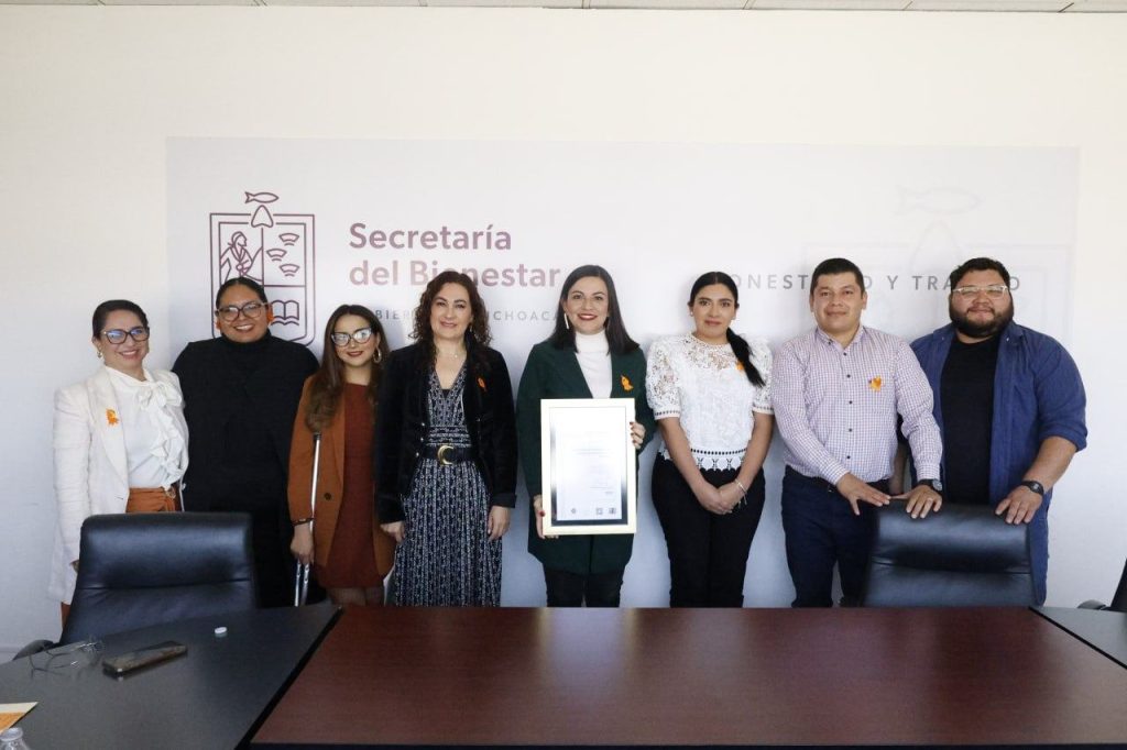 Morelia, Michoacán, 2 de diciembre de 2025.- La Secretaría del Bienestar (Sedebi), obtuvo el certificado de Espacio Libre de Violencia de Género, que otorga la Consultora Hermas SC, esto como resultado del compromiso institucional con la construcción de espacios laborales basados en el respeto, la seguridad y la equidad.