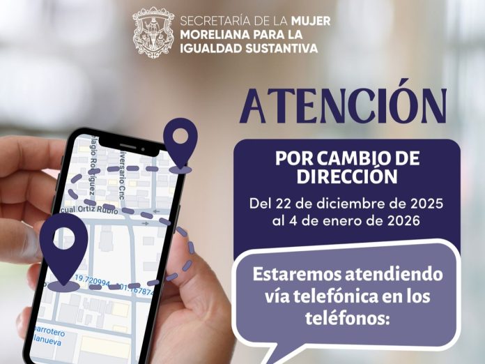 Morelia, Michoacán; 19 de diciembre de 2025.– Con el propósito de brindar atención continua y dar seguimiento puntual a las usuarias, la Secretaría de la Mujer Moreliana para la Igualdad Sustantiva (Semmujeris) informa a la ciudadanía que, derivado del cambio de dirección de sus oficinas, la atención presencial será suspendida de manera temporal del 22 de diciembre de 2025 al 04 de enero de 2026.