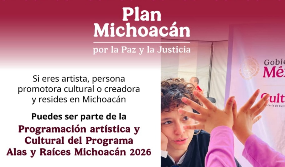 Morelia, Michoacán, 9 de febrero de 2026.- La Secretaría de Cultura de Michoacán (Secum), en coordinación con su homónima federal, lanzó la invitación para integrar la programación artística y cultural del Programa Alas y Raíces Michoacán 2026, dirigida a personas promotoras culturales, talleristas, narradoras y artistas residentes en la entidad.