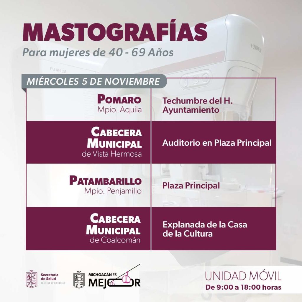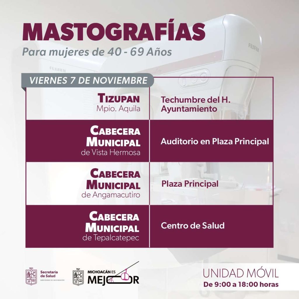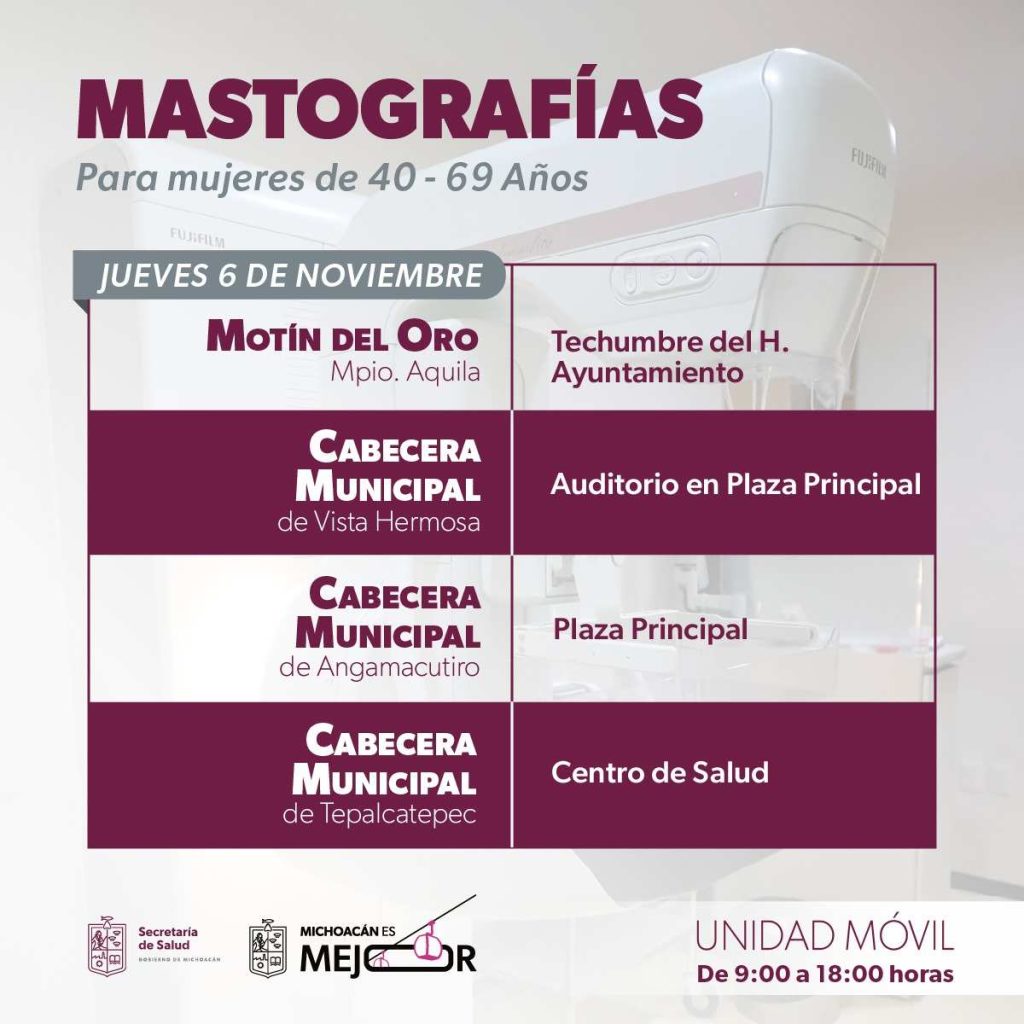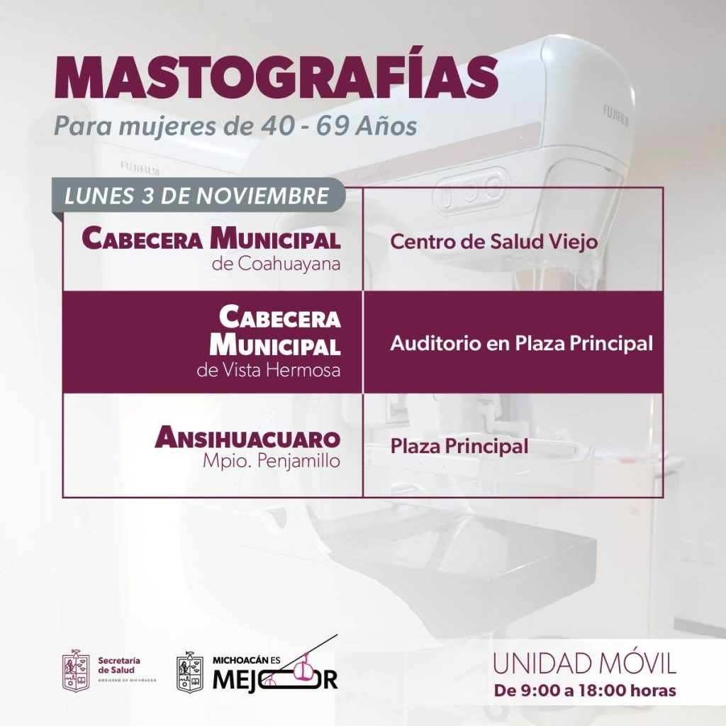Las unidades móviles visitarán Coahuayana, Vista Hermosa, Penjamillo, Aquila, Coalcomán, Angamacutiro y Tepalcatepec. Los estudios están dirigidos a mujeres de 40 a 69 años que, debido a la ubicación geográfica, enfrentan dificultades para trasladarse a unidades médicas en sus lugares de origen.