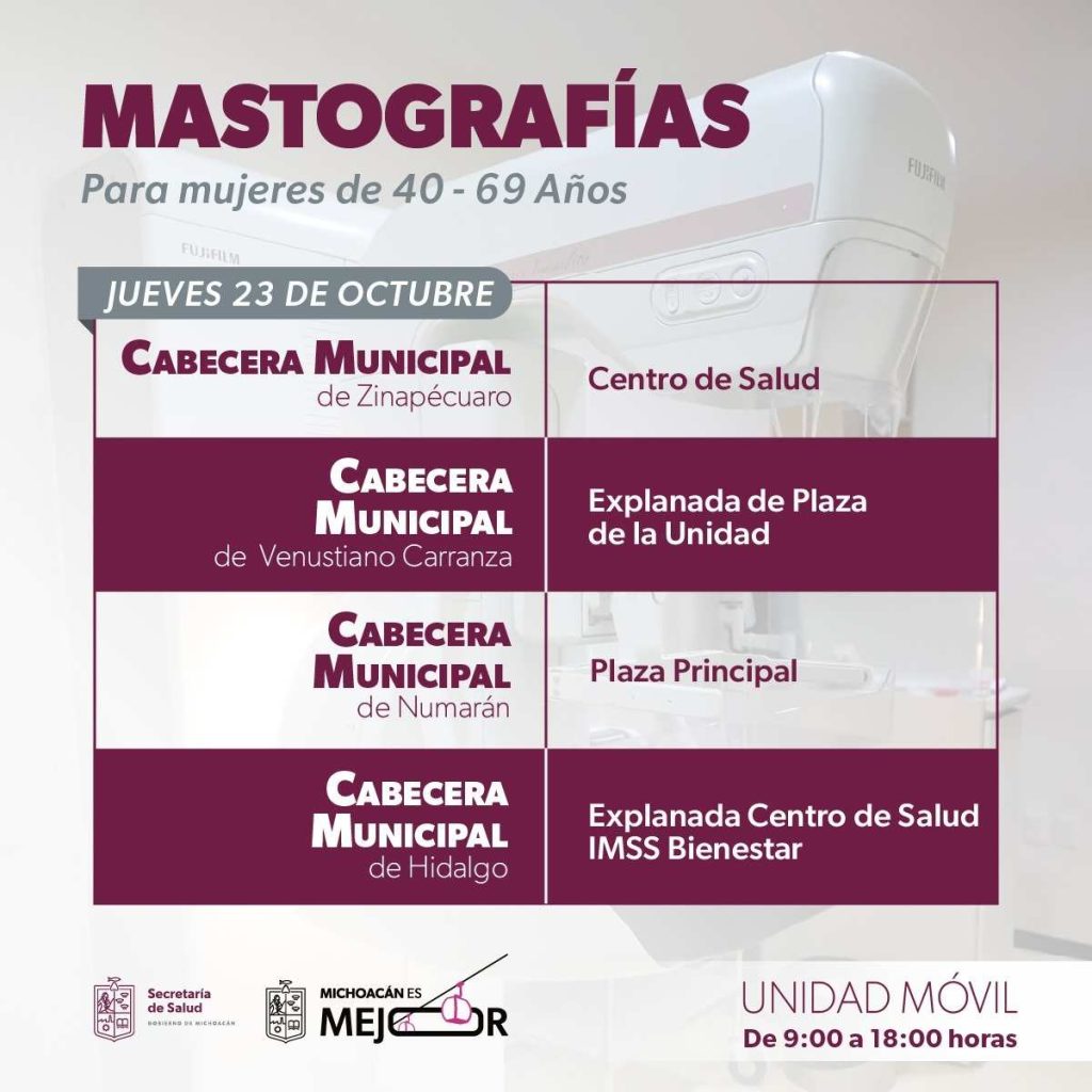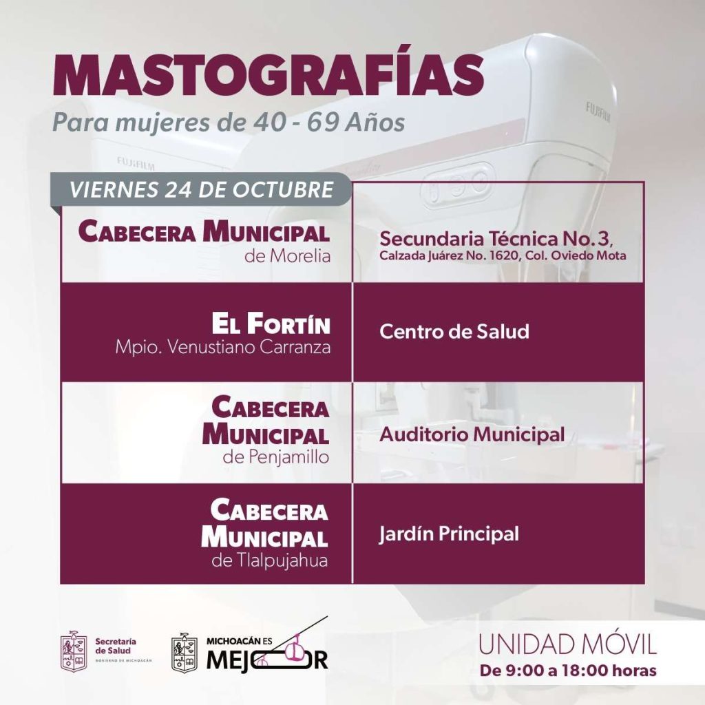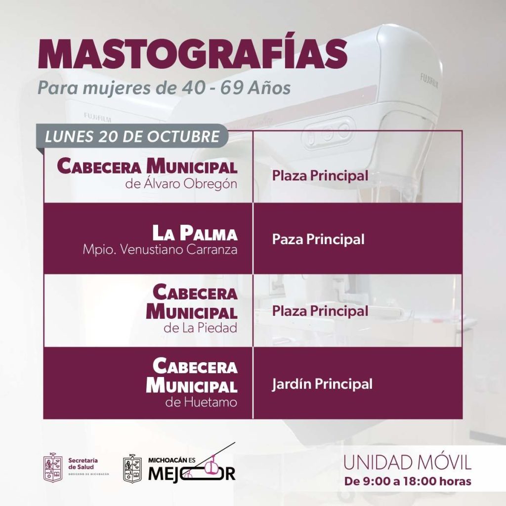 Álvaro Obregón, Venustiano Carranza, La Piedad, Huetamo, Zinapécuaro, Benito Juárez, Numarán, Hidalgo, Morelia, Penjamillo y Tlalpujahua son los municipios en los que las mujeres podrán realizarse el estudio de manera gratuita, solo tendrán que presentarse con una copia de su identificación oficial, aseadas, rasuradas y sin uso de perfumes, cremas y talcos o joyas, la atención será otorgada en un horario de 9:00 a 18:00 horas.