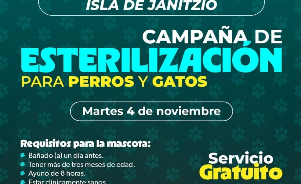 Morelia, Michoacán, 29 de octubre de 2025.- Este próximo 4 de noviembre, la Secretaría de Salud de Michoacán (SSM), llevará a cabo una jornada gratuita de esterilización canina y felina a la isla de Janitzio, en busca de promover la tenencia responsable y contribuir al control poblacional de animales de compañía en la comunidad.