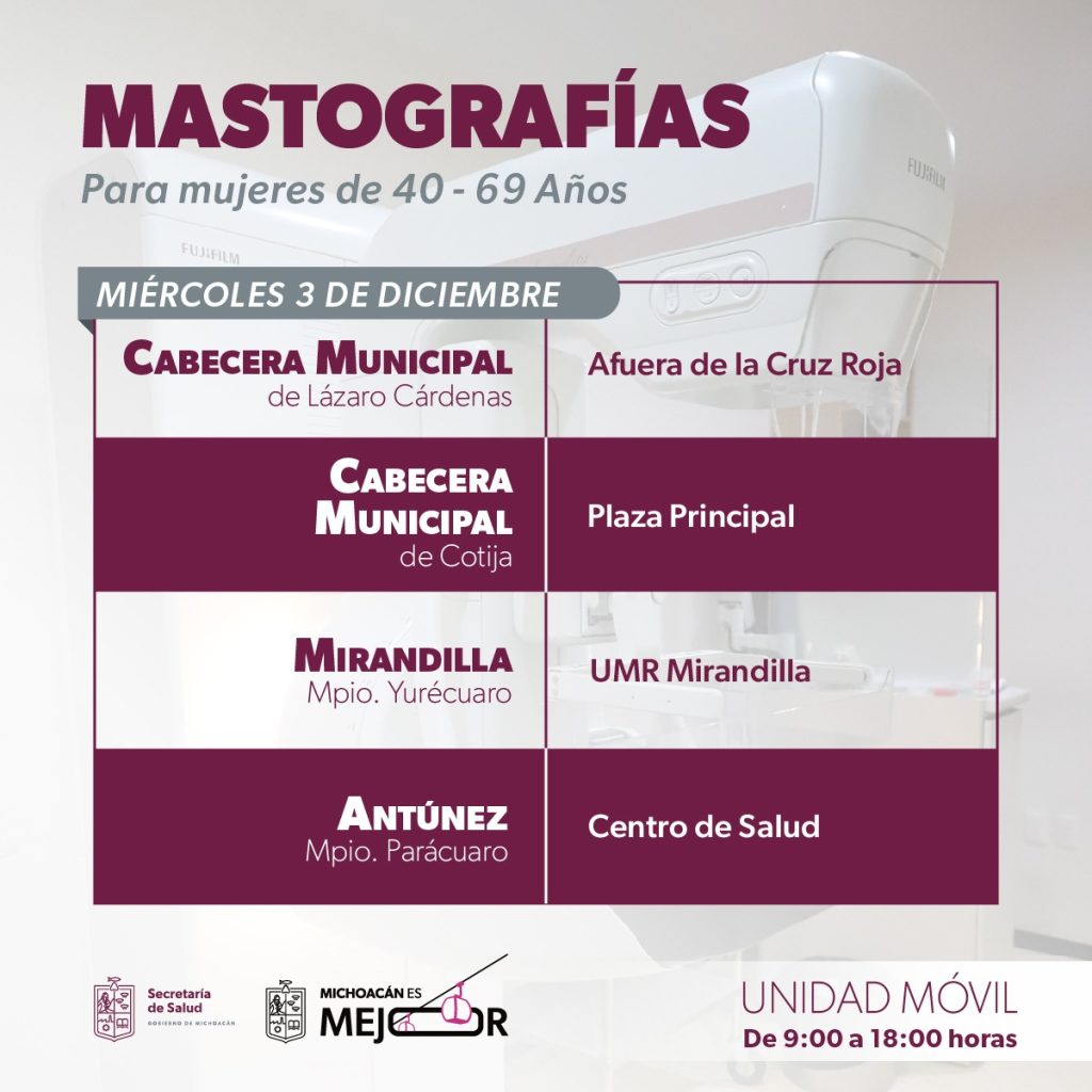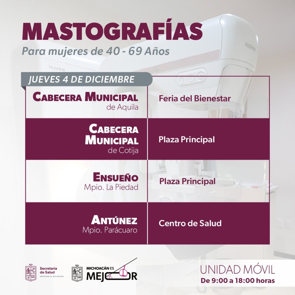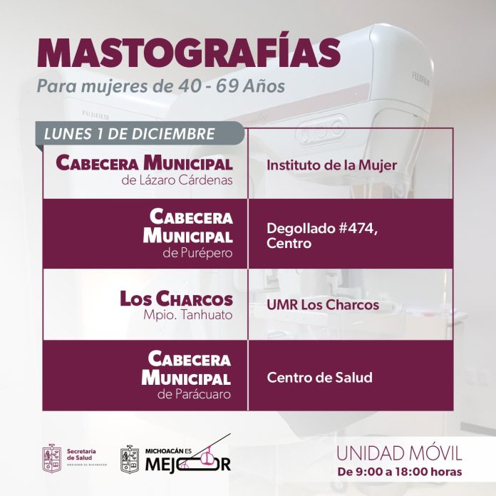 Morelia, Michoacán, 29 de noviembre de 2025.- Durante diciembre, la Secretaría de Salud de Michoacán (SSM) continúa con las acciones de detección oportuna del cáncer de mama en mujeres de 40 a 69 años, con el despliegue de unidades móviles de mastografía en 10 municipios del estado.