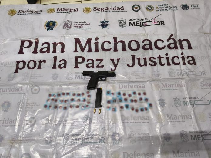 Uruapan, Michoacán, 11 de marzo de 2026.- En una acción operativa, agentes de la Secretaría de Seguridad Pública de Michoacán (SSP) detuvieron a un hombre y aseguraron a dos adolescentes que se encontraban en posesión de un arma de fuego y 54 dosis de una sustancia granulosa con características propias de la metanfetamina.
