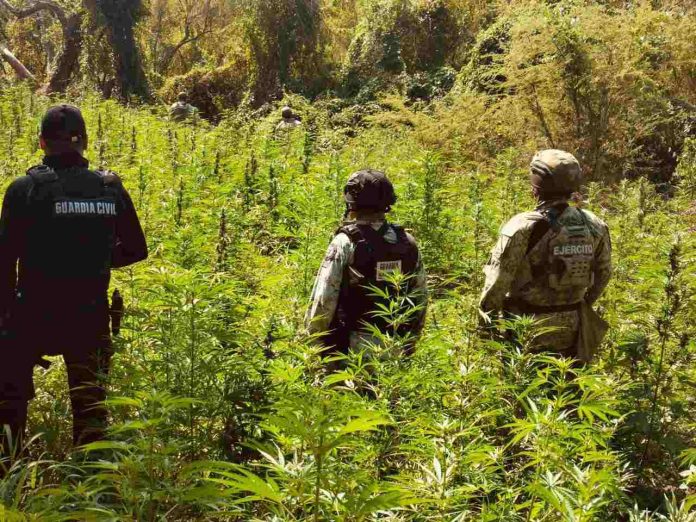 Buenavista, Michoacán, 17 de febrero de 2026.- Como resultado de un operativo interinstitucional, elementos de las secretarías de Seguridad Pública (SSP) y de la Defensa Nacional (Defensa), en conjunto con la Guardia Nacional (GN), localizaron y destruyeron un plantío con más de seis mil plantas de marihuana; en el mismo acto, se procedió a la incineración de aproximadamente 50 kilogramos de dicho enervante.