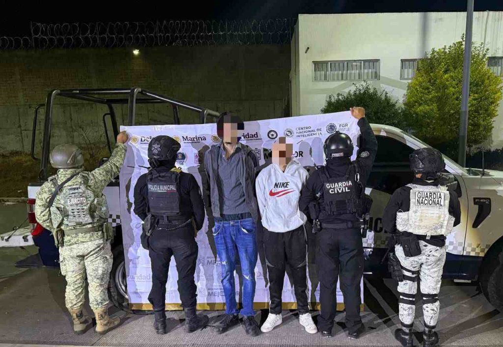En otro hecho, sobre un tramo carretero del municipio de Jacona, efectivos de seguridad detuvieron a dos hombres tras una persecución. Los implicados tripulaban una camioneta marca GMC que contaba con reporte de robo con violencia; durante la intervención, se les incautó un arma de fuego corta.