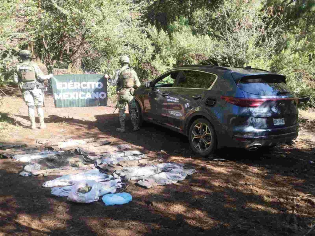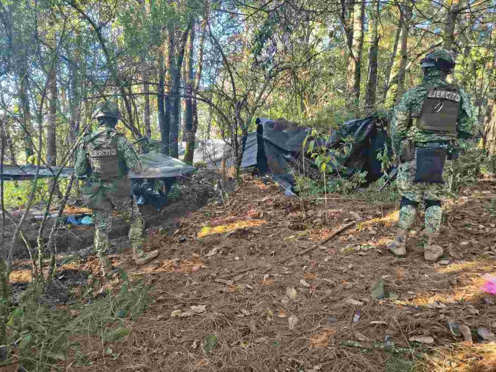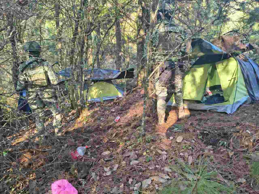La acción operativa tuvo lugar en la localidad del Tepetate, zona donde las fuerzas de seguridad localizaron los asentamientos y fueron encontrados dos vehículos de las marcas Kia y Honda, este último con impactos de arma de fuego, diversas prendas tácticas con imágenes alusivas a grupos delictivos y 12 casas de campaña.