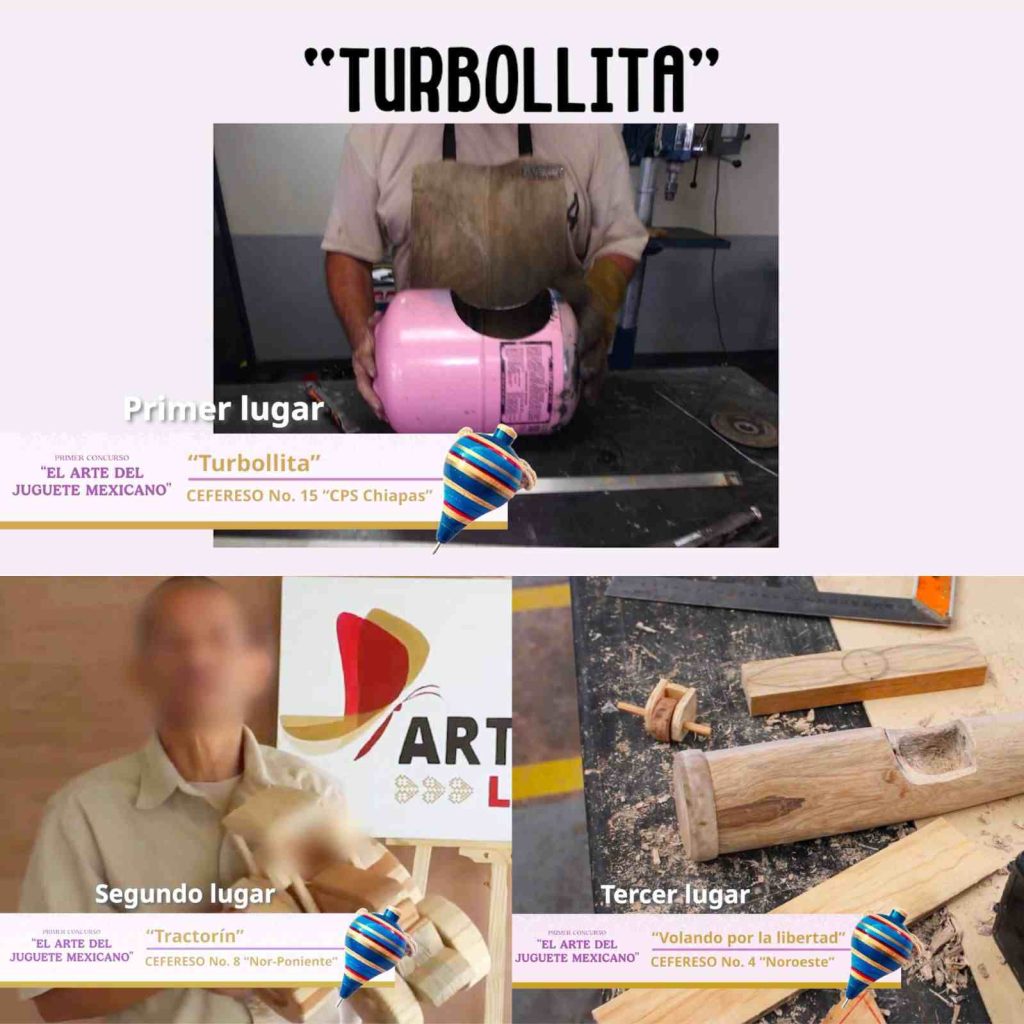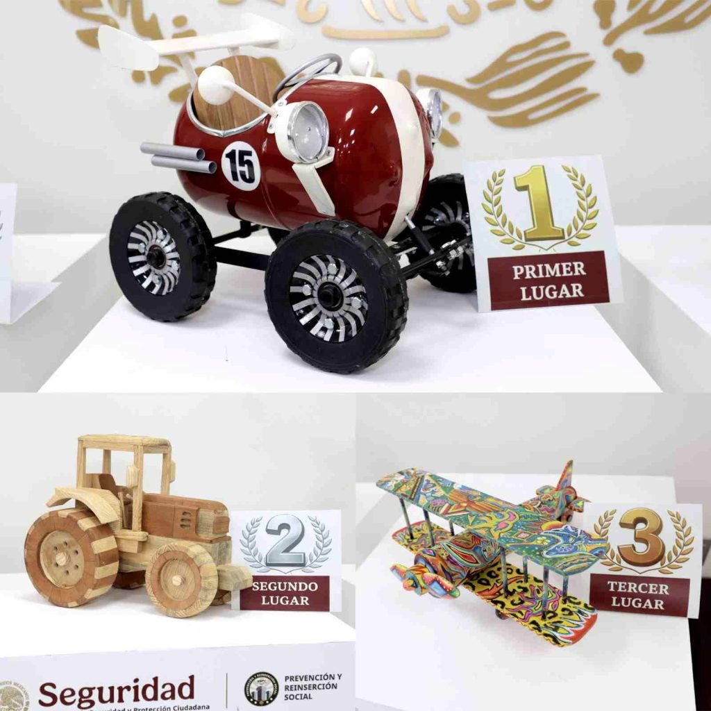 El primer lugar fue otorgado al juguete “Turbollita”, elaborado en el CEFERESO No. 15 “CPS Chiapas”; el segundo lugar correspondió al juguete “Tractorín”, del CEFERESO No. 8 “Nor-Poniente”; y el tercer lugar fue para la avioneta “El inicio de un vuelo”, del CEFERESO No. 4 “Noroeste”.