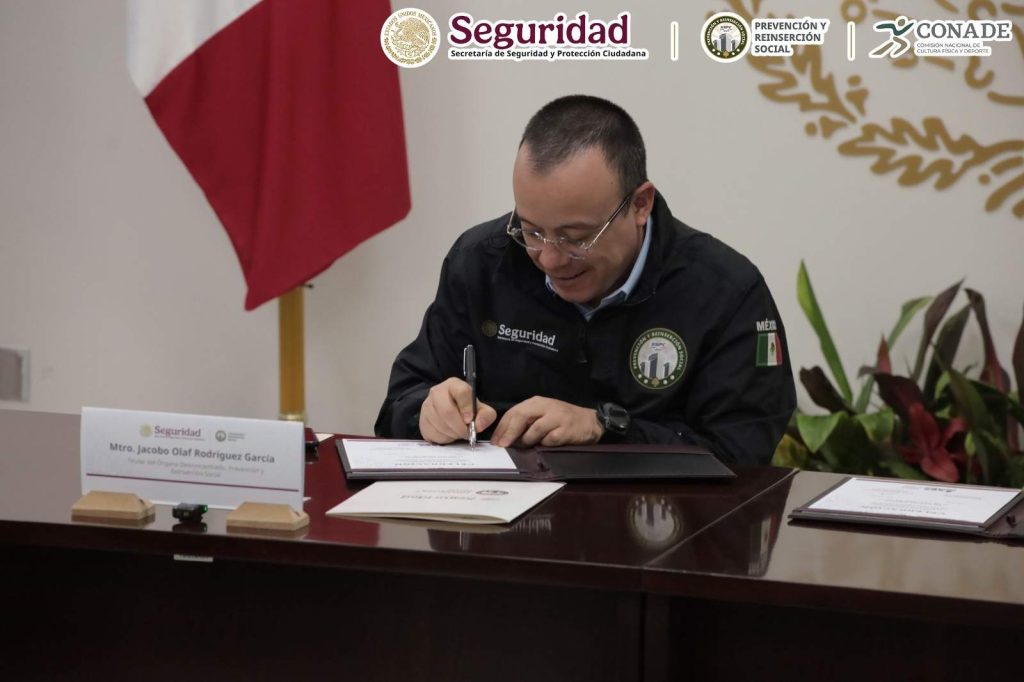 El titular de Prevención y Reinserción Social, Jacobo Olaf Rodríguez García, y el director general de la CONADE, Rommel Pacheco Marrufo, firmaron este acuerdo en el que renovaron las bases de cooperación y los mecanismos operativos entre ambas instituciones, con el propósito de coordinar programas que contribuyan a mejorar la calidad de vida de las personas privadas de la libertad, impulsar su reinserción social mediante la práctica del deporte, la recreación y actividad física.