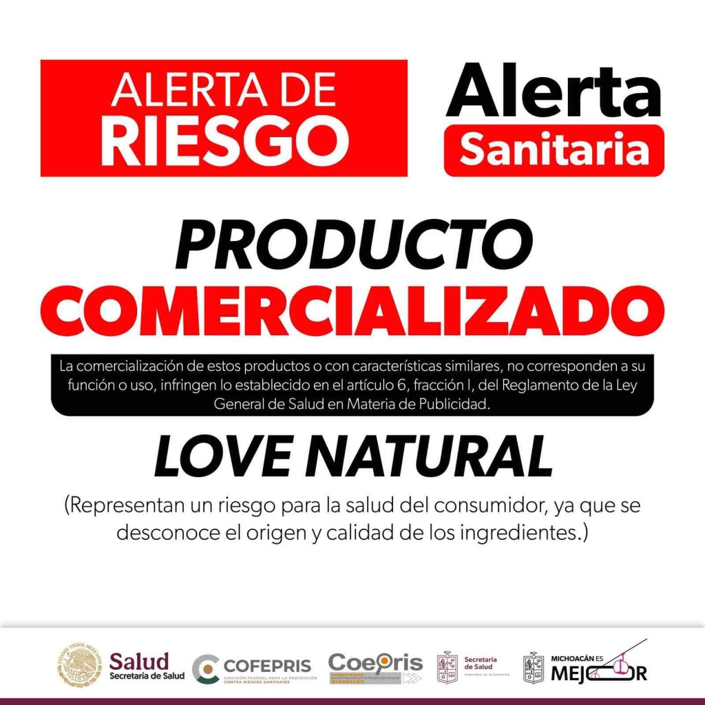 Morelia, Michoacán, 8 de diciembre de 2025.- La Comisión Federal para la Protección contra Riesgos Sanitarios (Cofepris), a través de la Secretaría de Salud de Michoacán (SSM), alerta a la población sobre el riesgo sanitario de los suplementos alimenticios Love Natural, los cuales se comercializan sin cumplir la legislación vigente, representando un peligro para la salud.