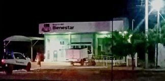 Camioneta choca y termina dentro del Banco del Bienestar de Múgica