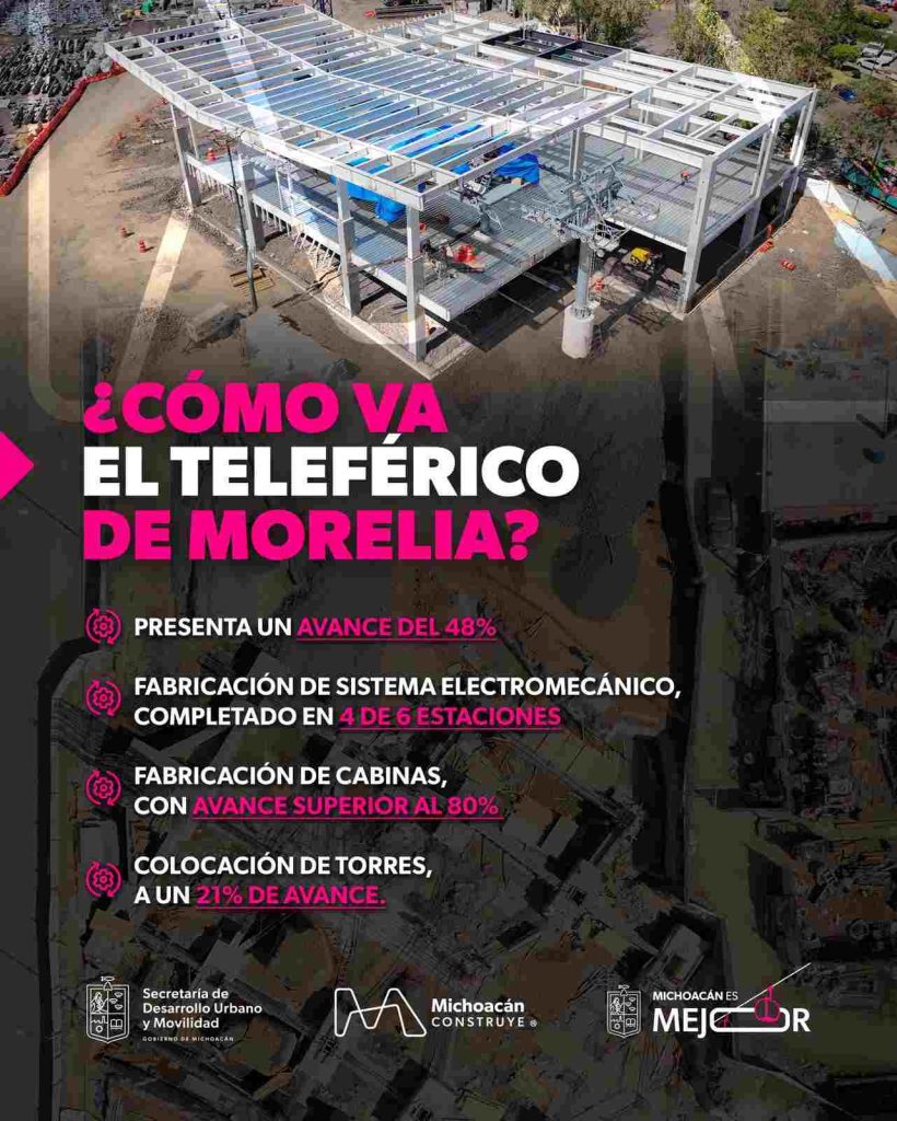 “El teleférico de Morelia presenta un avance general del 48 por ciento, se continúa con la construcción de las siete estaciones que tendrá inicialmente este proyecto de movilidad y ya se están recibiendo las primeras cabinas que circularán por la ciudad”, resaltó la funcionaria estatal.