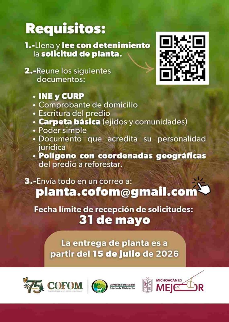 Morelia, Michoacán, 9 de febrero de 2026.- La Comisión Forestal de Michoacán (Cofom) invita a la ciudadanía a solicitar sus plantas destinadas a la restauración de suelos forestales. Las y los interesados en participar en la temporada de reforestación de este año podrán realizar su trámite desde ahora y hasta el domingo 31 de mayo.