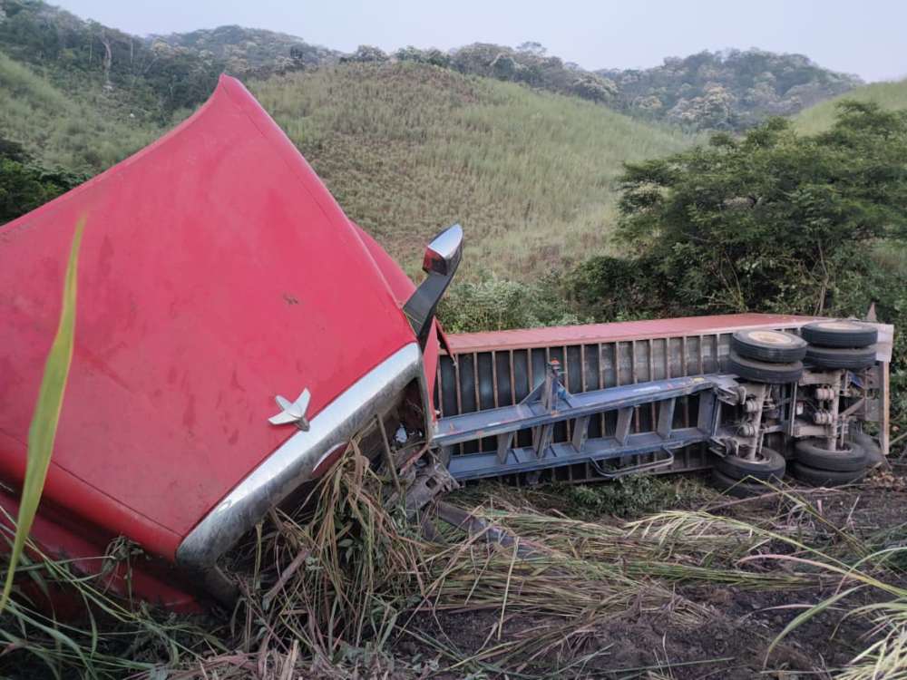 El aparatoso accidente tuvo lugar, en el kilómetro 264 del tramo carretero Las Cañas – Feliciano, donde un camión Peterbilt de color rojo con placas 37-UZ-1X, terminó destrozado por fuera de la vialidad.