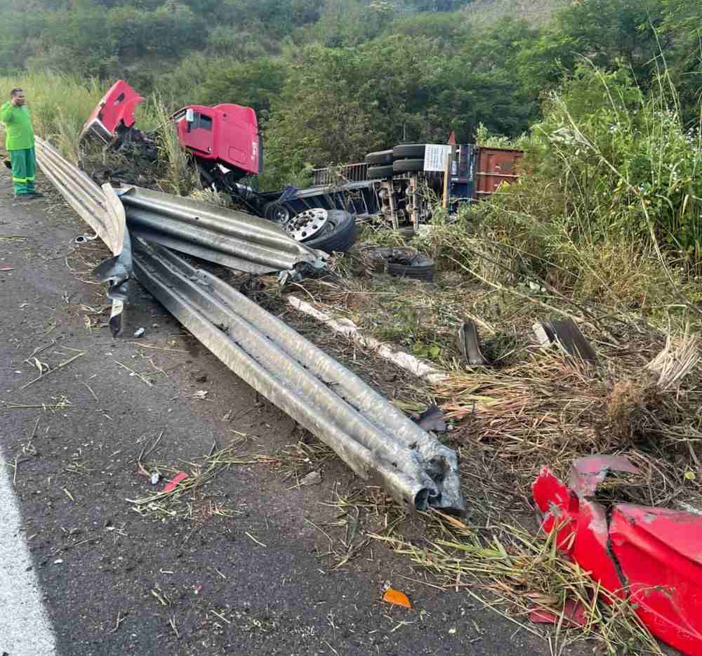 La Unión, Guerrero.- 05 de noviembre de 2025.- Un camión de carga se salió de la carpeta asfáltica y se precipitó a un desnivel a un costado de la autopista Siglo XXI, milagrosamente su conductor resultó ileso.