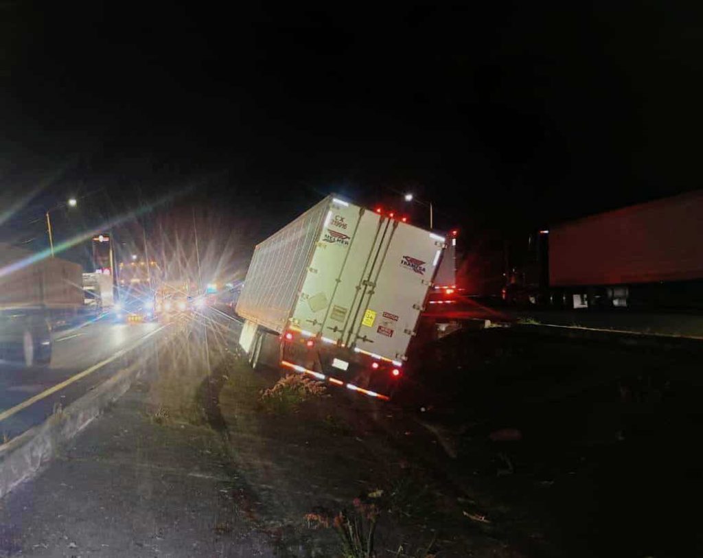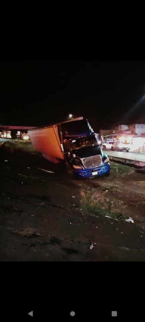 Panindícuaro, Mich.- Martes 09 de diciembre de 2025.- Un tractocamión que se quedó sin frenos detuvo su avance al caer a la cuneta central de la autopista México-Guadalajara, con ello el conductor evitó una tragedia, informaron fuentes policiales y de rescate.