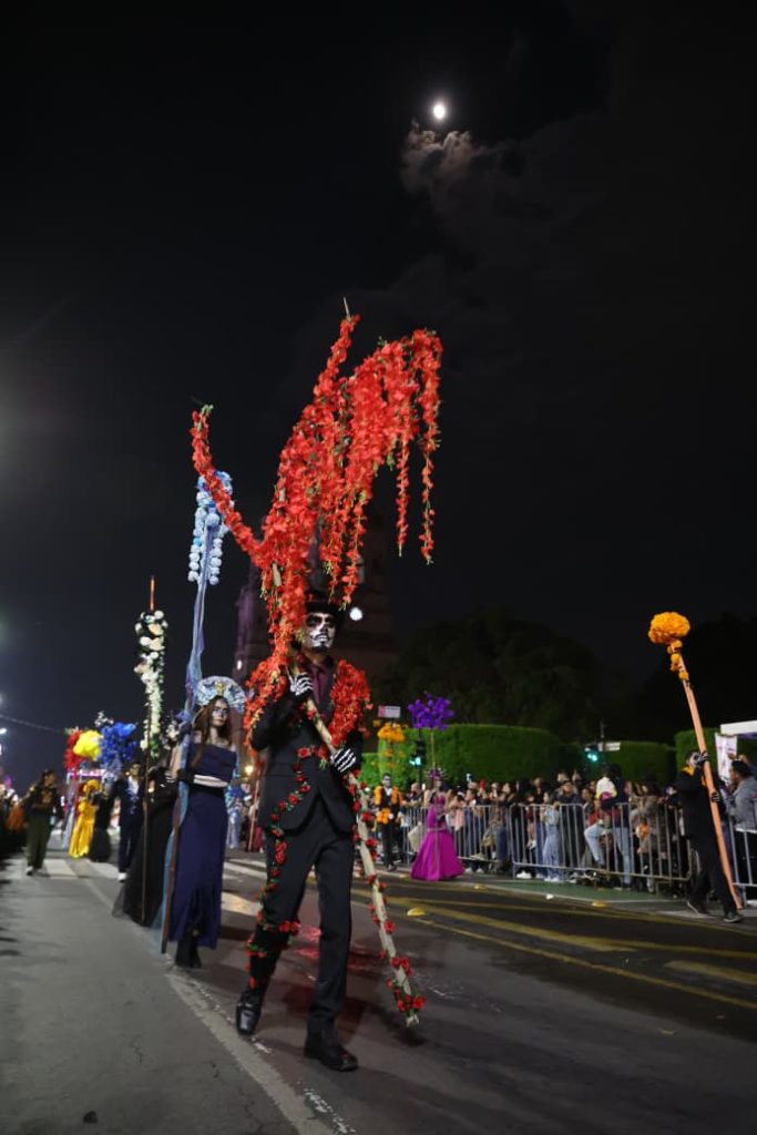 Sobre la avenida Madero, en el corazón de la capital, miles de catrinas y catrines desfilaron mostrando sus más elegantes prendas. Algunos de ellos, portaban sombreros, veladoras y coronas de cempasúchil.