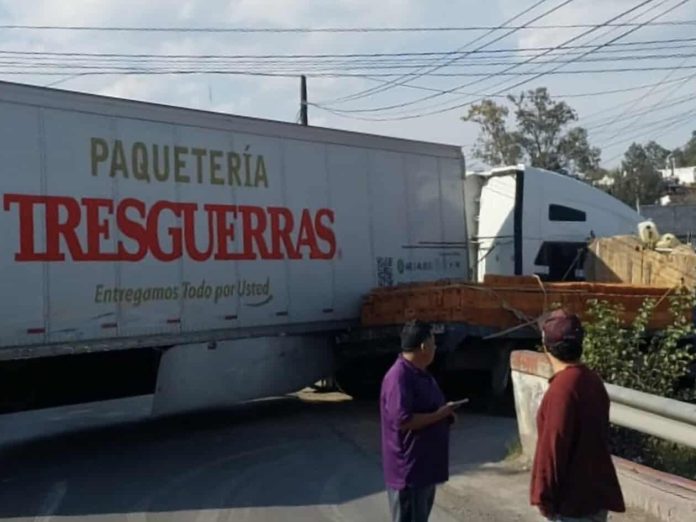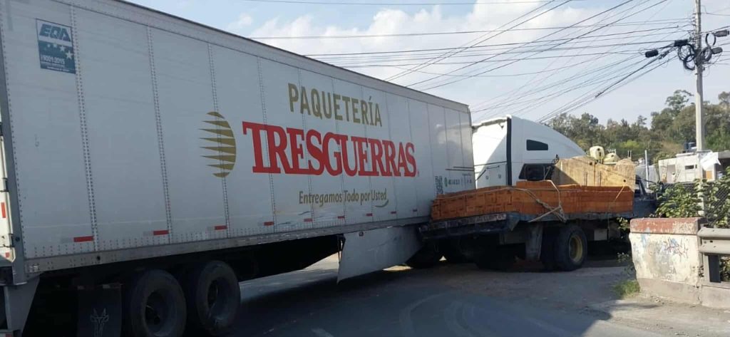 Morelia, Mich.- Jueves 15 de enero de 2026.- Un tráiler de la empresa de paquetería Tres Guerras y un camión tradrillero protagonizaron un choque sobre el Periférico Paseo de la República, en la zona nororiente de Morelia, hecho que solo dejó daños materiales, informaron fuentes policiales.