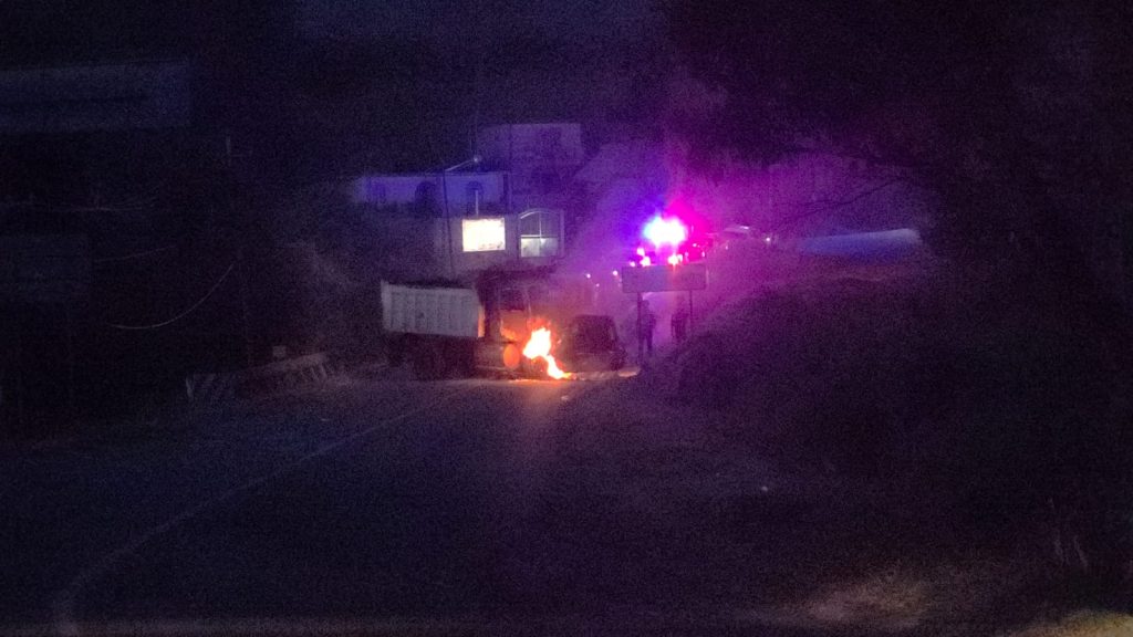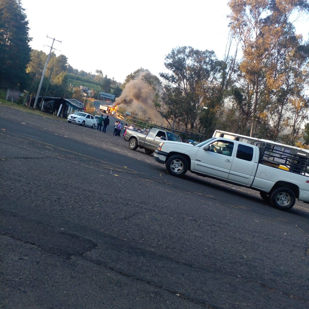 Trascendió que sobre la carretera Pátzcuaro-Uruapan, a la altura de la población de Ajuno, los delincuentes atravesaron un camión tipo volteo y lo quemaron.