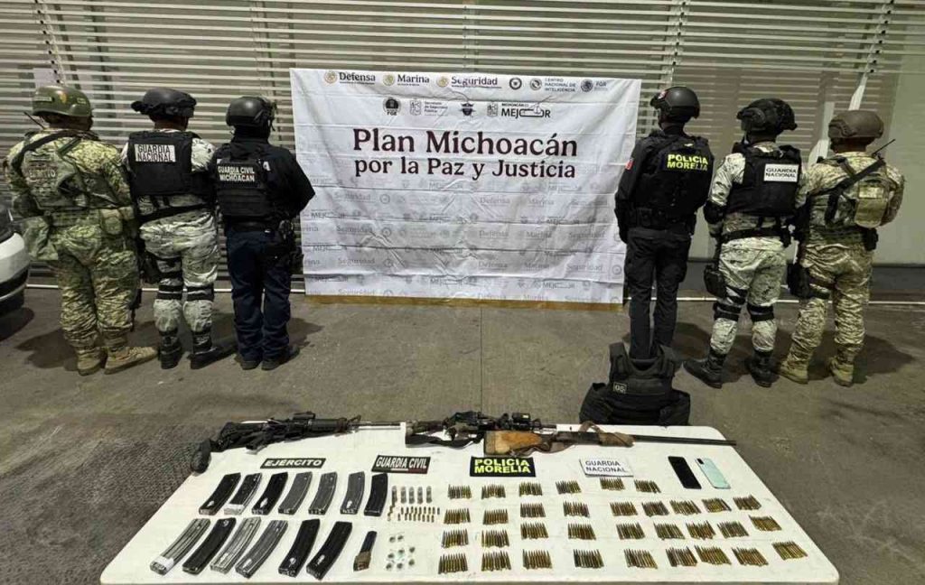 Tarímbaro, Michoacán, 27 de noviembre de 2025.- Derivado de las acciones operativas del Plan Michoacán por la Paz y la Justicia, en el municipio de Tarímbaro, elementos de las secretarías de Seguridad Pública (SSP) y de la Defensa Nacional (Defensa), aseguraron tres armas de fuego, más de 300 municiones y droga luego de responder una agresión armada.