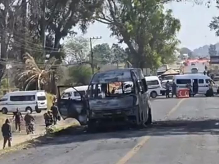 Tarímbaro, Mich.- Sábado 07 de marzo de 2026.- En protesta por la combi que fue quemada por delincuentes durante la mañana de este sábado sobre la carretera Tarímbaro-Álvaro Obregón, a la altura de Cuitzillo Grande, varios choferes de la Ruta Gris con Negro se manifestaron y bloquearon la mencionada vialidad para exigir seguridad y la reparación del daño.