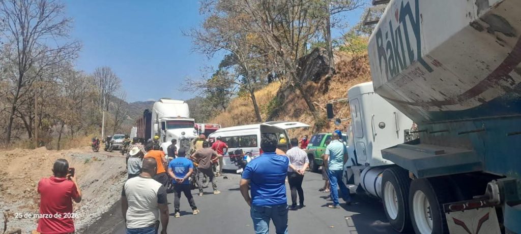 Uruapan, Mich.- 25 de marzo de 2026.- Al menos 3 personas lesionadas, dos de ellas prensadas, dejó como saldo un choque frontal entre un tráiler y una camioneta tipo van de pasajeros, ocurrido la tarde de este miércoles sobre la carretera “libre” Uruapan-Lombardía.