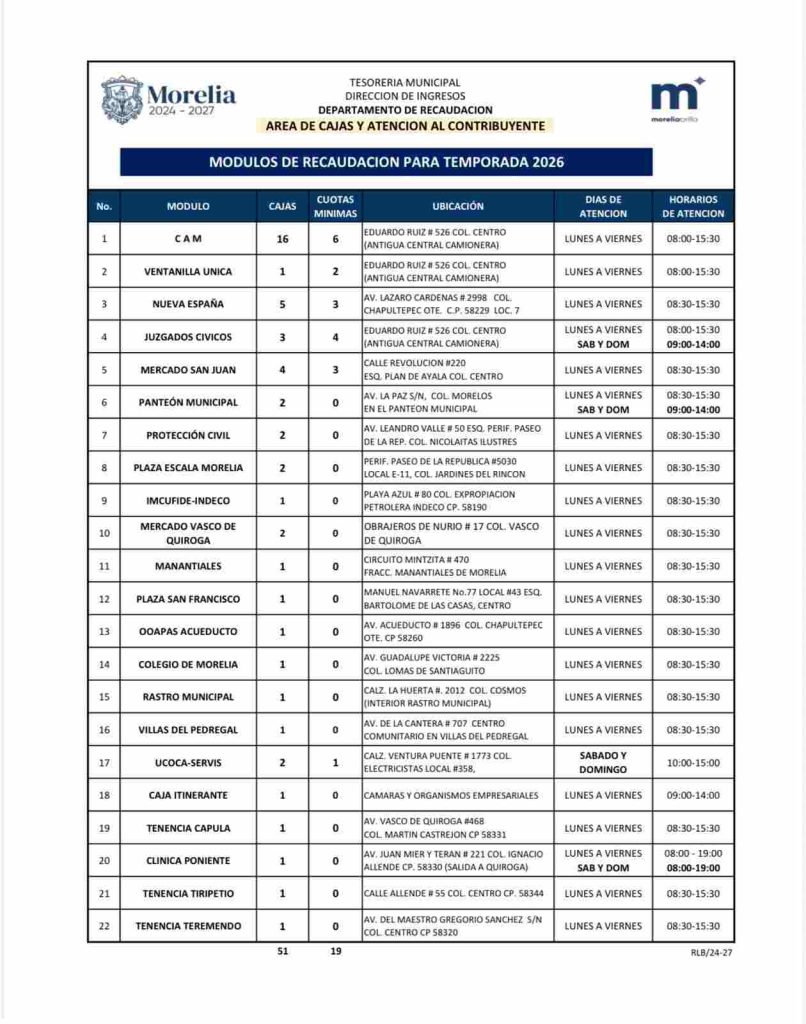 Por su densidad poblacional o distancia del Centro de la ciudad, se contará también con ventanillas de atención en Villas del Pedregal y las tenencias de Capula, Teremendo y Tiripetio.