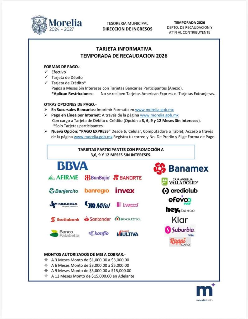 Además de los puntos fijos también se podrá realizar el pago en línea, en efectivo o bien con tarjeta de débito y crédito; con algunas tarjetas podrá obtener plazo de 3, 6, 9 y 12 meses sin interés. De igual forma, se podrá pagar a través de la nueva opción “PAGO EXPRESS” con el celular, computadora o Tablet, ingresando desde la página www.morelia.gob.mx. Solo hay que registrar un correo electrónico junto con el número de predio, y elegir la forma de pago.