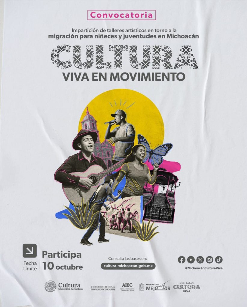 Morelia, Michoacán, 10 de octubre de 2025.- La Secretaría de Cultura de Michoacán (Secum) invita a creadoras, creadores y facilitadores comunitarios a participar en la convocatoria “Cultura Viva en Movimiento”, que cierra este viernes 10 de octubre.