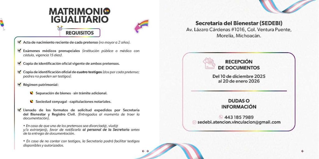 Morelia, Michoacán, 13 de enero de 2026.- La Secretaría del Bienestar (Sedebi), que encabeza Andrea Serna Hernández, informó que el próximo 20 de enero concluye el periodo de recepción de documentos para participar en la jornada “Bodas de la Diversidad Sexual y Reconocimientos al Cambio de Identidad de Género. Un legado de lucha y resistencia”. Este evento, coordinado con el Registro Civil y la Secretaría de Cultura estatal, tendrá lugar el 30 de enero en el Centro Cultural Clavijero.