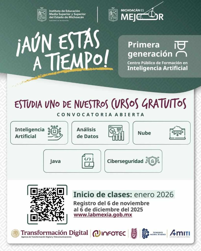 Morelia, Michoacán, 4 de diciembre de 2025.- El Instituto de Educación Media Superior y Superior de Michoacán (Iemsysem) invita a estudiantes de bachillerato y universidad a registrarse al nuevo Centro Público de Formación en Inteligencia Artificial, la fecha límite es el próximo 6 de diciembre.