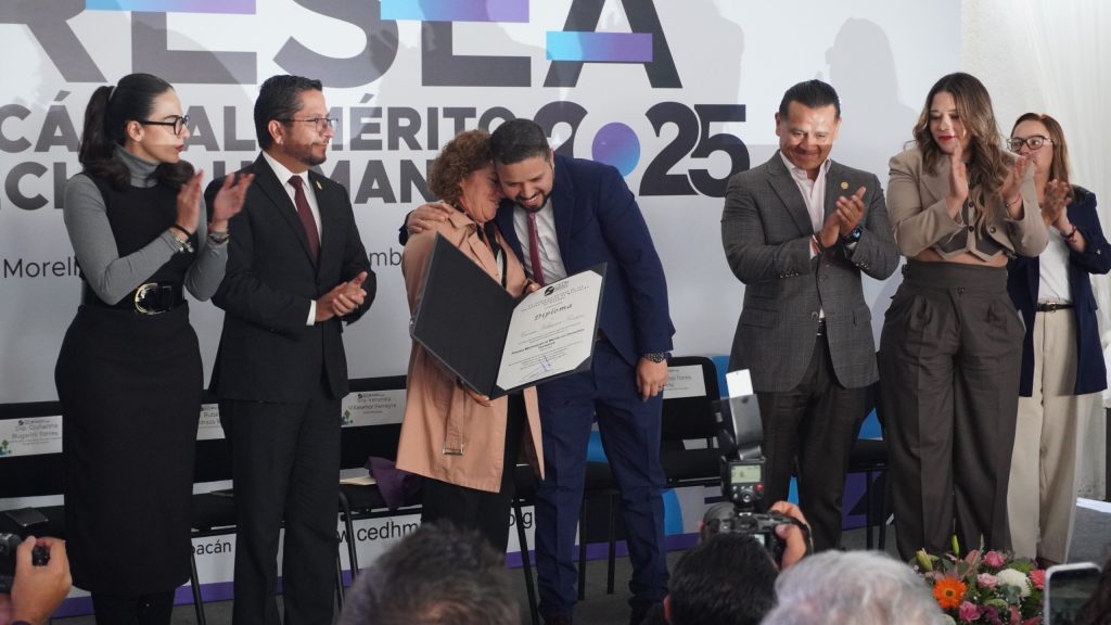 Morelia, Michoacán, 10 de diciembre del 2025. En el marco de la conmemoración del Día Internacional de los Derechos Humanos, el ombudsperson Josué Mejía Pineda, realizó la entrega de la Presea Michoacán al Mérito en Derechos Humanos 2025, a la señora Verónica Villaseñor Ferreyra, por ser un “ejemplo de fuerza, valor y resiliencia que ha transformado el dolor en esperanza”.