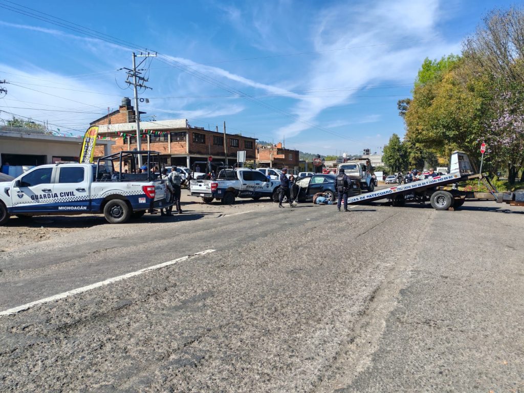 El aparatoso accidente ocurrió durante la mañana de este viernes, a la altura de la población de Tzurumútaro, y se puede observar como la camnioneta de la Guardia Civil busca hacer una maniobra para pasar a su lado izquierdo, cuando un Jetta color negro se le impacta en la parte posterior, sonde la patrulla iba repleta de uniformados.
