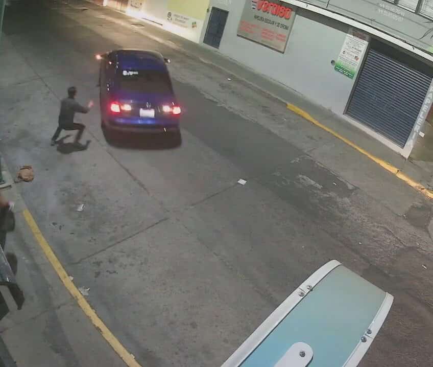 Al realizar esta acción agresiva, el hombre descuidó su automóvil y olvidó accionar el freno de mano, por lo que el coche comenzó a retroceder sin control, con la puerta del piloto abierta, la cual impactó levemente a otro vehículo que estaba estacionado en una esquina. Posteriormente, la unidad se detuvo al chocar con la retaguardia la fachada de un domicilio.