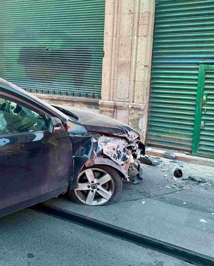 Morelia, Mich.- Miércoles 15 de octubre de 2025.- Un automovilista chocó contra la fachada de un inmueble en pleno Centro Histórico de Morelia. Afortunadamente no hubo lesionados, sólo daños materiales, comentaron autoridades policiales.