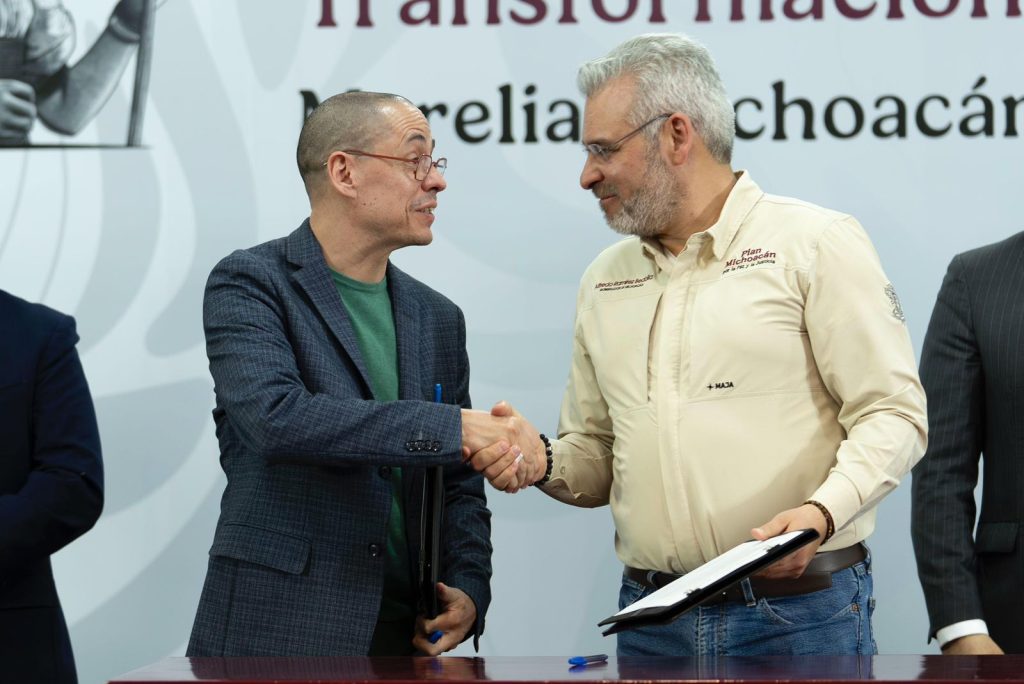 Morelia, Michoacán, 26 de febrero de 2026.– A fin de agilizar y simplificar los trámites que realiza la población ante el Gobierno de Michoacán y el Gobierno Federal, el gobernador Alfredo Ramírez Bedolla firmó un convenio de colaboración con José Antonio Peña Merino, titular de la Agencia de Transformación Digital y Telecomunicaciones.