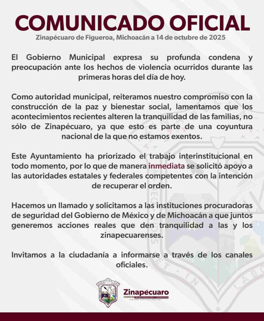 Zinapécuaro, Mich.- Martes 14 de octubre de 2025. – Delincuentes fuertemente armados rafaguearon la presidencia municipal de Zinapécuaro y arrojaron explosivos desde drones, ataque que también dañó al menos tres domicilios y además terminó destruido un poste con cámaras de vigilancia del C5, informaron autoridades policiales.