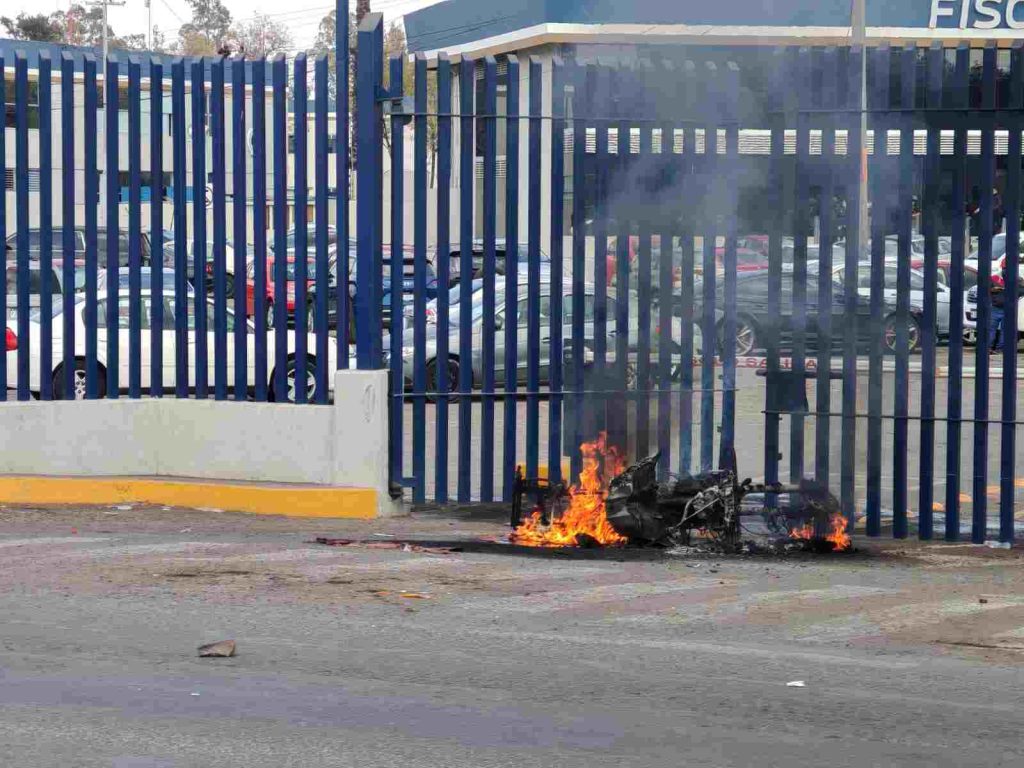 Morelia, Mich.- Lunes 08 de diciembre de 2025.- Un grupo de comuneros de Carapan quemó una motopatrulla de la Guardia Civil (GC) afuera del barandal perimetral de la Fiscalía General del Estado (FGE), en la ciudad de Morelia.