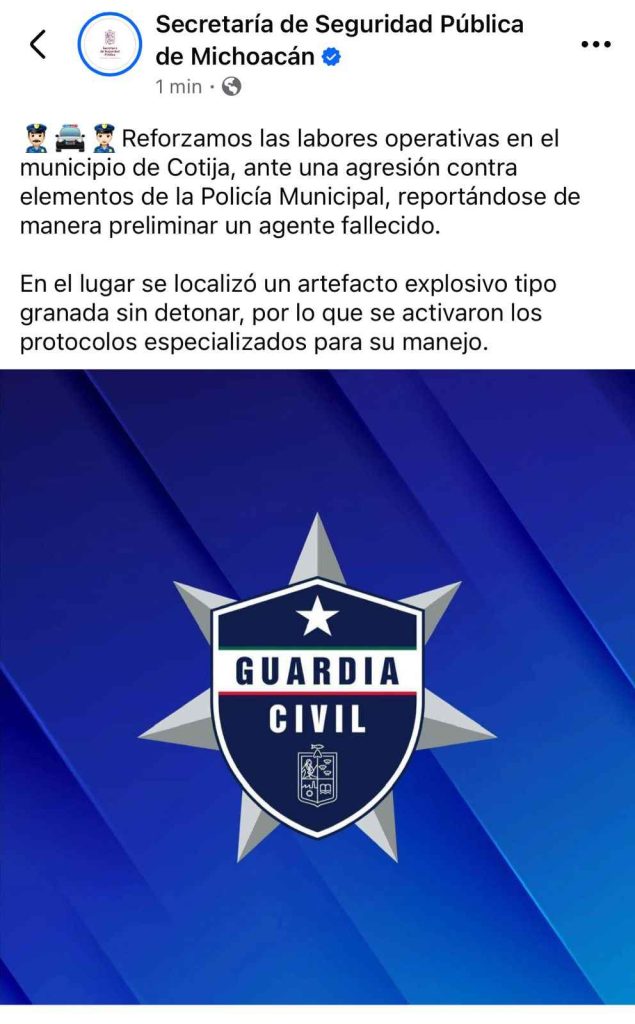 Morelia, Mich.- Martes 09 de diciembre de 2025.- Unos delincuentes armados atacaron a agentes municipales de Cotija, informaron fuentes policiales, las cuales señalaron que la agresión dejó un oficial muerto.