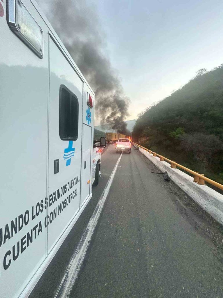 La Unión, Guerrero.- 02 de Febrero del 2026.- La mañana de este lunes se registró un fatídico choque entre una camioneta y un camión de carga, sobre la autopista Siglo XXI, dejó como saldo preliminar dos personas sin vida y un lesionado grave. Las unidades involucradas se incendiaron ocasionando cierre total a la circulación.