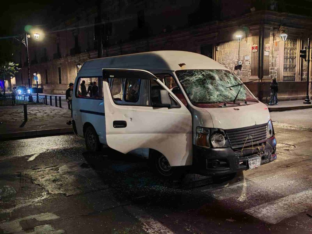 Morelia, Mich.- Martes 02 de noviembre de 2025.- Un grupo de sujetos vandalizó una combi y la atravesó sobre la avenida Francisco I. Madero, en el Centro Histórico de Morelia. Asimismo, se reportó una supuesta agresión a golpes en contra de una casa de estudiantes, cuyos moradores se deslindaron de lo sucedido.