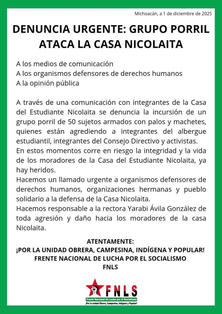 En el documento, el FNLS mencionó que la agresión registrada en la Casa del Estudiante Nicolaíta dejó lesionados, además solicitó la intervención de organismos defensores de derechos humanos para realizar las acciones conducentes.