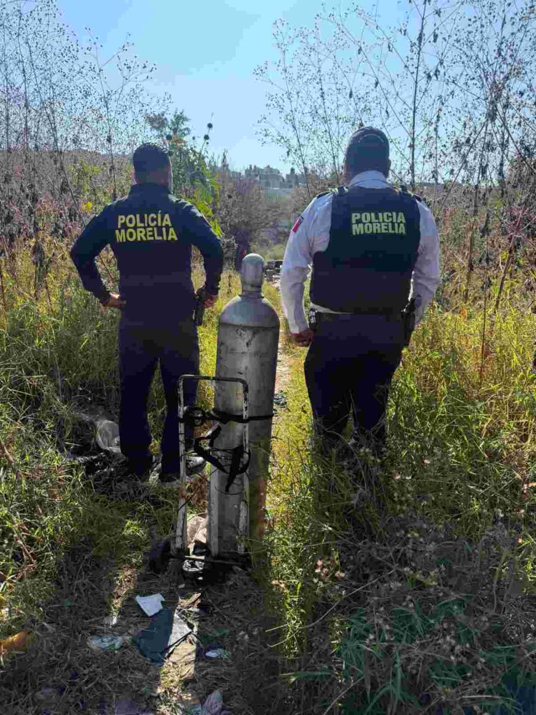 Morelia, Michoacán, a 31 de diciembre de 2025.- La mañana de este miércoles, elementos de la Policía Morelia recuperaron un cilindro con gas cloro que había sido sustraído del Pozo El Retiro, en la colonia Dr. Miguel Silva González.