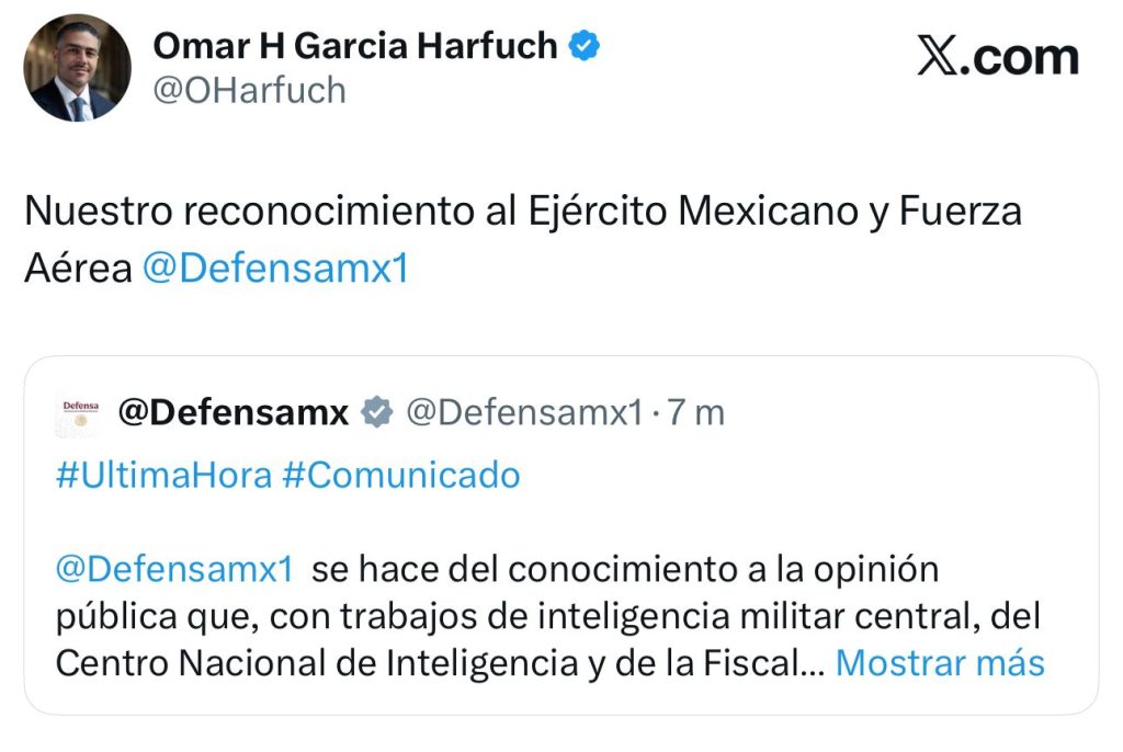 Tras difundirse el comunicado, el secretario de Seguridad y Protección Ciudadana, Omar García Harfuch, expresó públicamente su reconocimiento al Ejército Mexicano y a la Fuerza Aérea por la operación realizada, mediante un mensaje difundido en su cuenta oficial en la red social X.