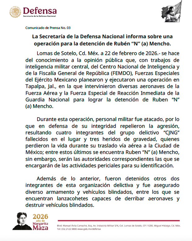 Ciudad de México.- 22 de febrero de 2026.- La Secretaría de la Defensa Nacional (DEFENSA) confirmó la muerte de Nemesio Rubén Oseguera Cervantes, alias “El Mencho”, identificado como líder del Cártel Jalisco Nueva Generación (CJNG), tras un operativo militar realizado en Tapalpa, Jalisco.