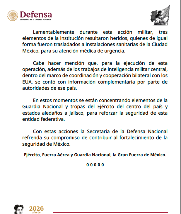 Finalmente, la DEFENSA informó que se concentran elementos adicionales de la Guardia Nacional y del Ejército en Jalisco y estados aledaños para reforzar la seguridad y prevenir posibles reacciones del grupo criminal. La institución reiteró su compromiso de contribuir al fortalecimiento de la seguridad nacional.