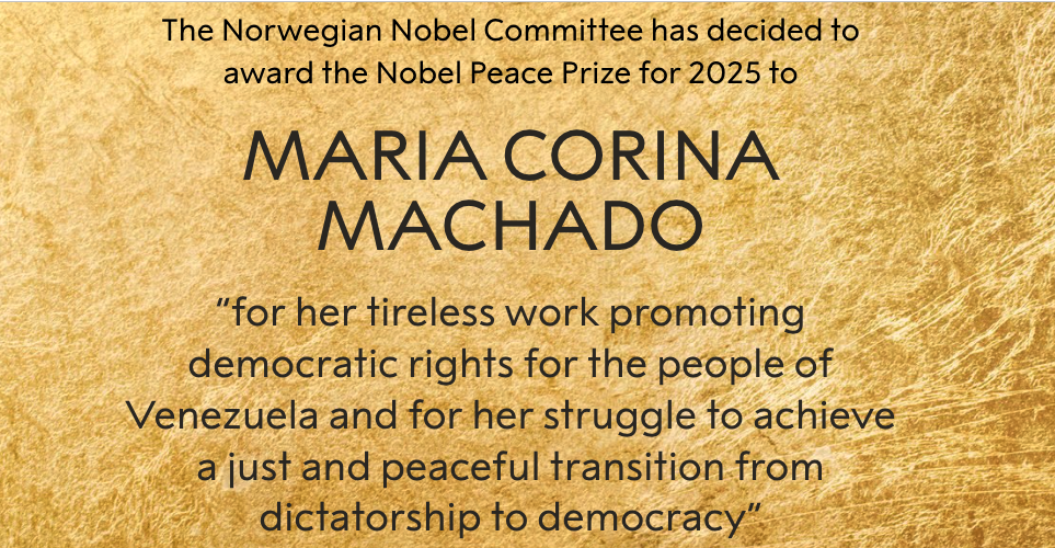 • En la lectura del fallo a su favor el Presidente del Comité Noruego del Nobel, Jorgen Watne Frydnes, destacó lo siguiente: ”El Premio Nobel de La Paz 2025 se otorga a una valiente y comprometida defensora de la paz, a una mujer que mantiene viva la llama de la democracia enmedio de una creciente oscuridad”.