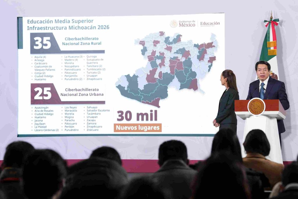 El secretario de Educación Pública, Mario Delgado Carrillo, informó que, en materia educativa, se construirán 10 nuevos bachilleratos tecnológicos en Aquila, Ario de Rosales, La Huacana, La Piedad, Los Reyes, Morelia, Puruándiro, Tangamandapio, Uruapan y Zitácuaro. Y se realizarán 20 ampliaciones, 35 ciberbachilleratos en zonas rurales y 25 en zonas urbanas, generando nuevos lugares para Educación Media Superior. Mientras que en Educación Superior serán 50 mil nuevos espacios, además de que, a través de la Agencia de Transformación Digital y Telecomunicaciones se abrieron certificaciones para 10 mil estudiantes: 5 mil de Media Superior y 5 mil de Superior, para los que ya hay 12 mil 717 personas registradas. Además, del 15 al 21 de diciembre, se abre la plataforma de registro para la Beca de Apoyo para Transporte Público “Gertrudis Bocanegra”, cuya entrega de tarjetas comienza en enero y que tendrá una inversión social de 768 millones de pesos (mdp).
