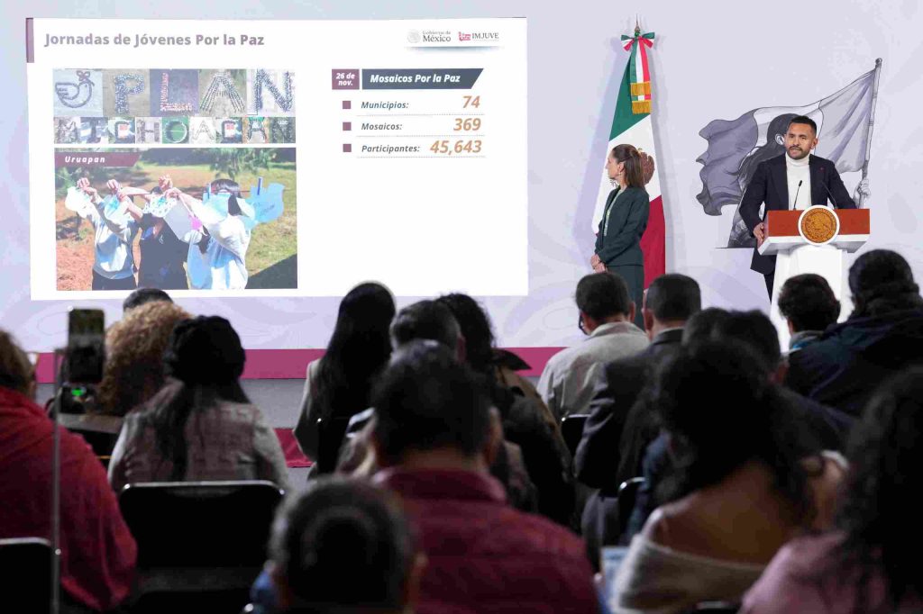 El director general del Instituto Mexicano de la Juventud (IMJUVE), Abraham Carro Toledo, señaló que del 5 de noviembre al 9 de diciembre se han realizado más de 400 acciones para jóvenes entre Diálogos por la Paz, Tequios, actividades deportivas y culturales, en 98 municipios y 13 regiones con la participación de 35 mil 823 personas, además, en los Mosaicos por la Paz que se realizaron el 26 de noviembre en 74 municipios, se involucraron 45 mil 643 jóvenes realizando 369 mosaicos.